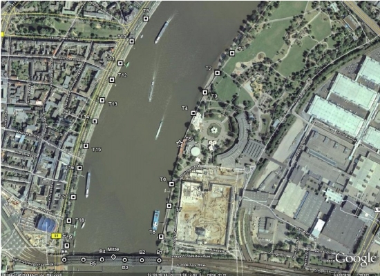 Bei der Großveranstaltung "Kölner Lichter" findet beidseitig des Rheinufers in Höhe der Innenstadt eine illuminierte Schiffsdurchfahrt mit anschließendem nächtlichen Feuerwerk statt. Zuvor und parallel wird diese Veranstaltung durch ein Musikbühnenprogramm sowie eine Musikuntermalung begleitet. Dazu werden eine Vielzahl von Lautsprechertürmen (T) betrieben, die beidseitig am Rhein aufgestellt werden sollen. Es werden mehrere 100.000 Zuschauer zu diesem Großereignis erwartet.