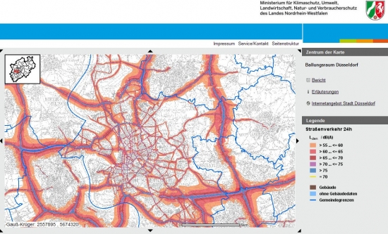 Die Landeshauptstadt Düsseldorf zählt entsprechend der EU-Umgebungslärmrichtlinie bzw. gemäß § 47 c BImSchG mit mehr als 250.000 Einwohnern zu den Ballungsräumen der ersten Stufe in Nordrhein-Westfalen. Bereits seit 2002 liegt dort ein stadtweites Lärmkataster vor, das alle relevanten Lärmquellen umfasst. Auf dieser Grundlage hat die Stadt aktuelle Berechnungen gemäß Umgebungslärmrichtlinie fristgerecht ausführen können, so daß die entsprechenden strategischen Lärmkarten auf dem Internetportal "Umgebungslärm" des Umweltministeriums NRW (s. umgebungslaerm.nrw.de) veröffentlicht werden konnten.
